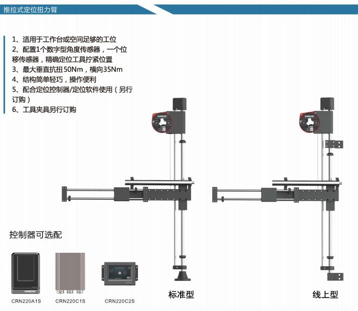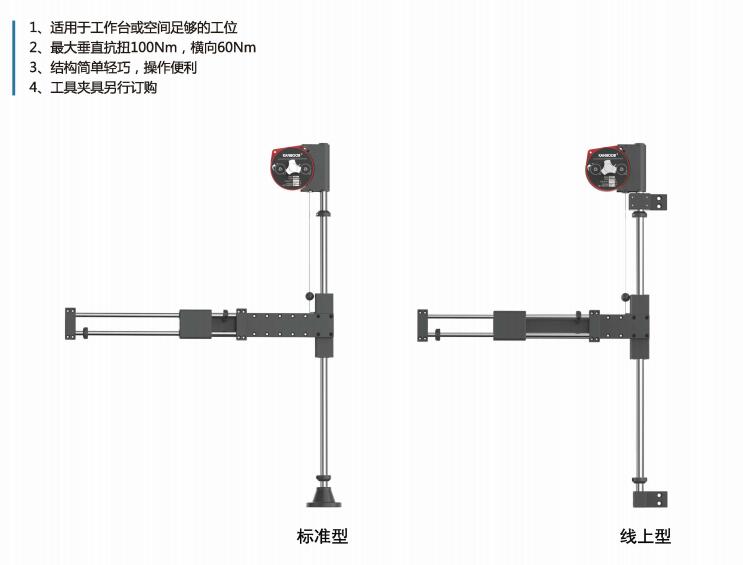 適用于工作臺或空間足夠的工位,配置1個數字型角度傳感器,一個位移傳感器,精確定位工具擰緊位置。最大垂直抗扭50Nm,橫向35Nm,結構簡單輕巧,操作便利。