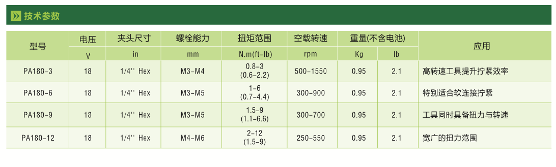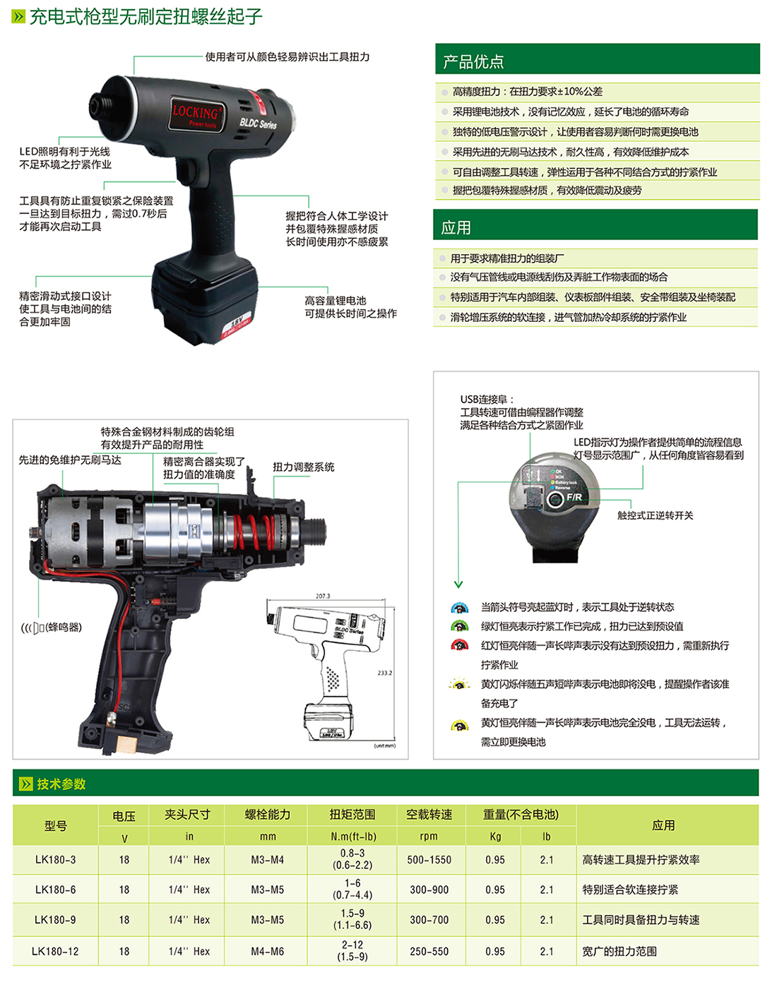高精度定扭:扭力公差+-10%;采用先進的鋰電池技術,電池壽命長;LED三色燈報警,NG/OK提示。扭力范圍:0.8-12Nm;先進的無刷馬達,耐久性高,有效降低維護成本;可自由調整工具轉速,應用不同的作業場景;人機工程設計,握感更好,有效降低震動及疲勞。
