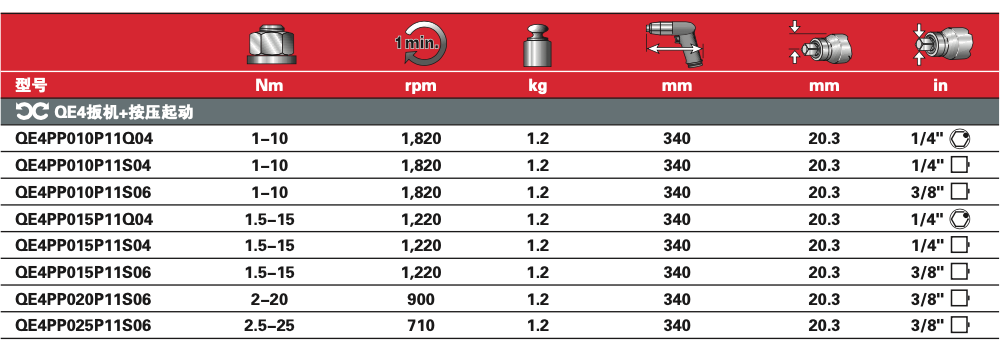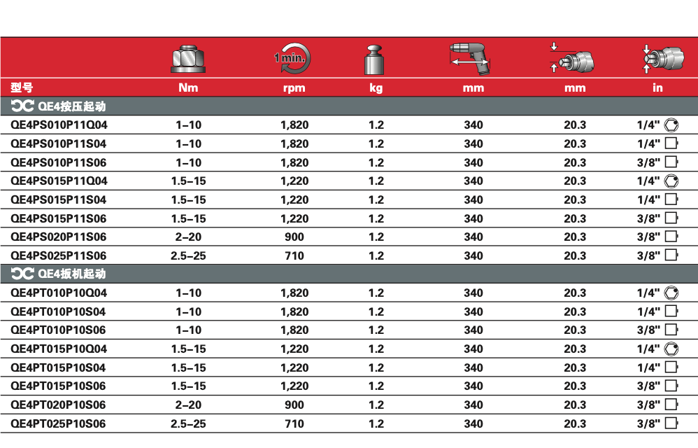 該系列讓您能夠修改工具以符合您的準確規格,可以改變扭矩輸出、擰緊軸類型、機身風格和動作。 具有 TactAlert、LED 前燈、按鈕反轉和指示燈選項以及多色燈環,QE4 直式系列的設計以用戶為中心。