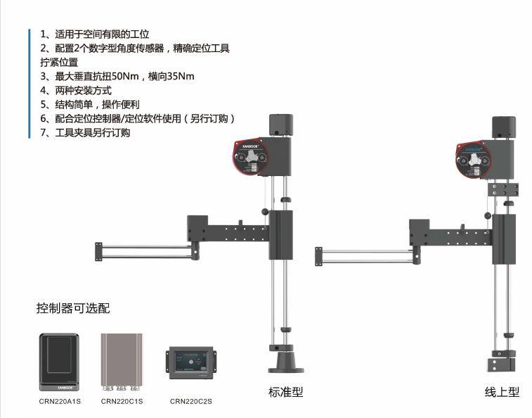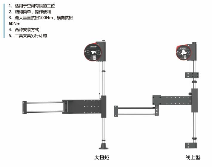 適用于空間有限的工位,配置2個數字型角度傳感器,精確定位工具擰緊位置。最大垂直抗扭50Nm,橫向35Nm。結構簡單操作便利。