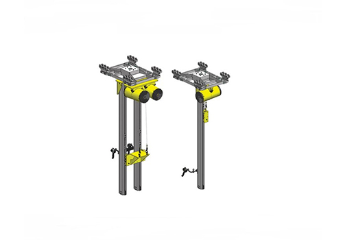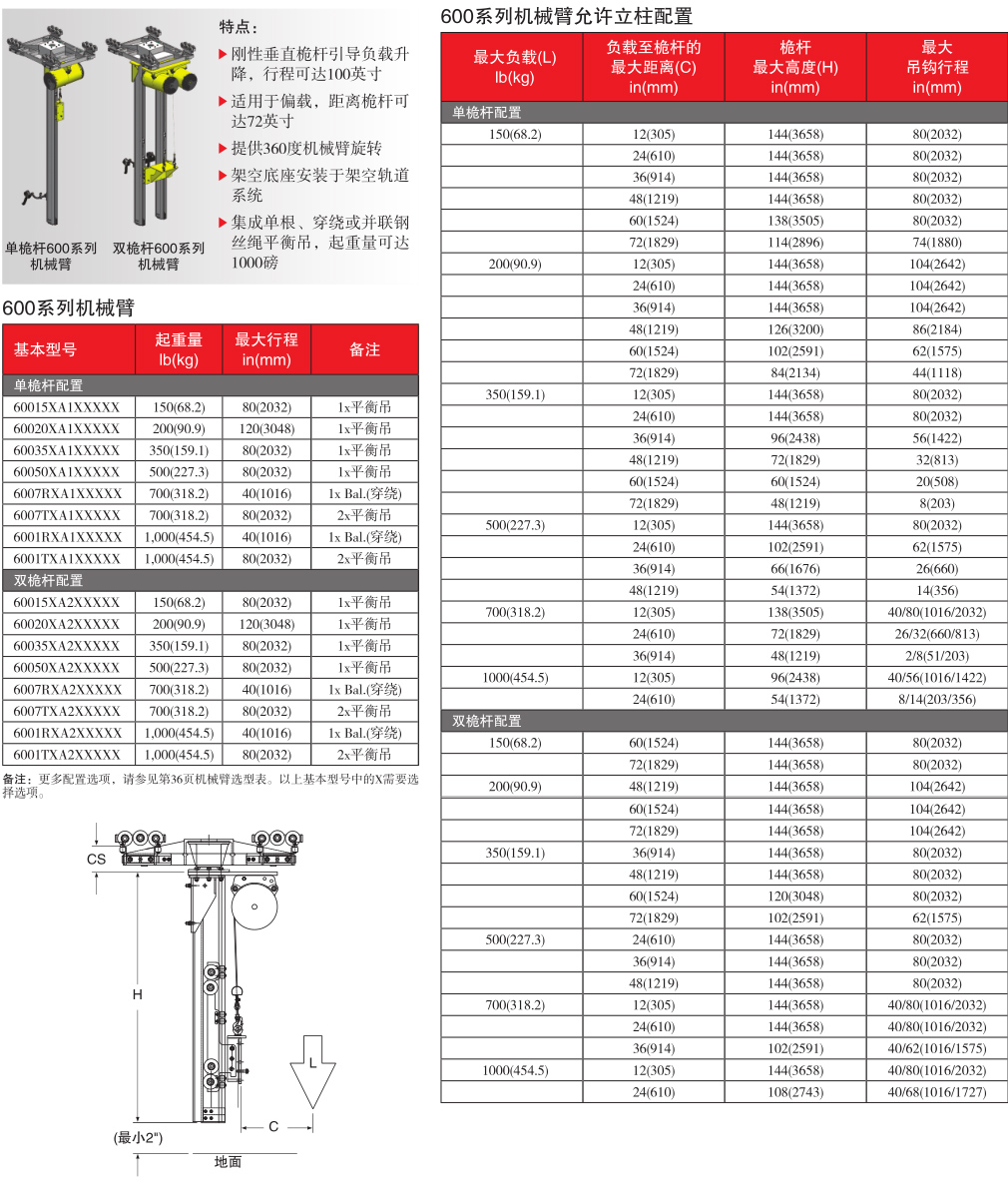 剛性垂直桅桿引導負載升 降,行程可達100英寸,適用于偏載,距離桅桿可 達72英寸,提供360度機械臂旋轉,架空底座安裝于架空軌道 系統,集成單根、穿繞或并聯鋼 絲繩平衡吊,起重量可達 1000磅。