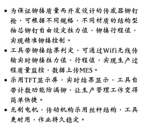 ? 為保證鉚接質量而開發設計的傳感器鉚螺母槍,可根據不同規格,不同材質的拉鉚螺母自由設定拉力值,鉚接行程值,實現精準鉚接控制。
